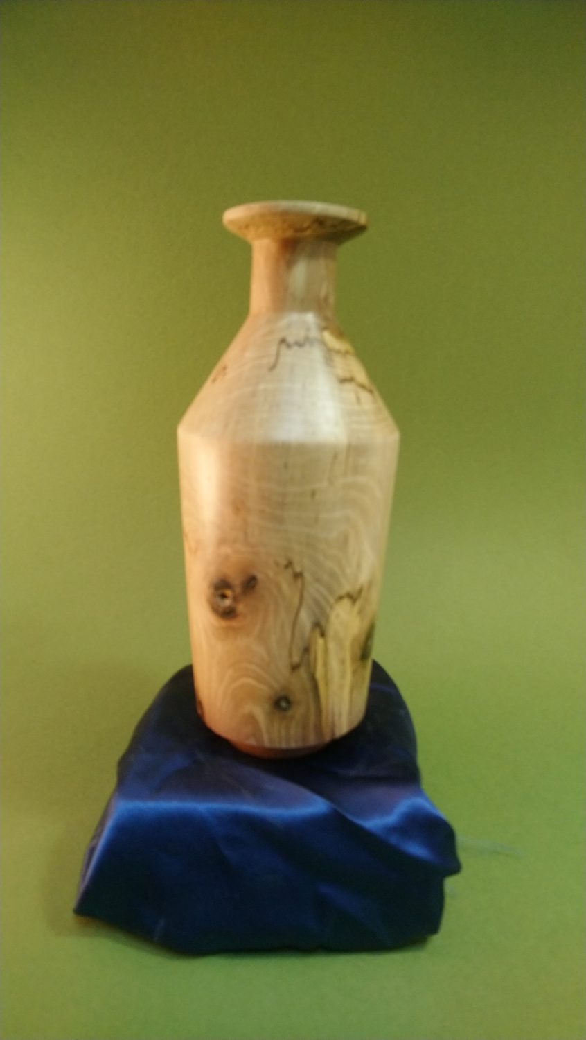 This modern design Stem Vase, hand turned from Spalted English Walnut has been finished with several coats of wax polish to a semi gloss finish to bring out the natural colour and beauty of the wood.