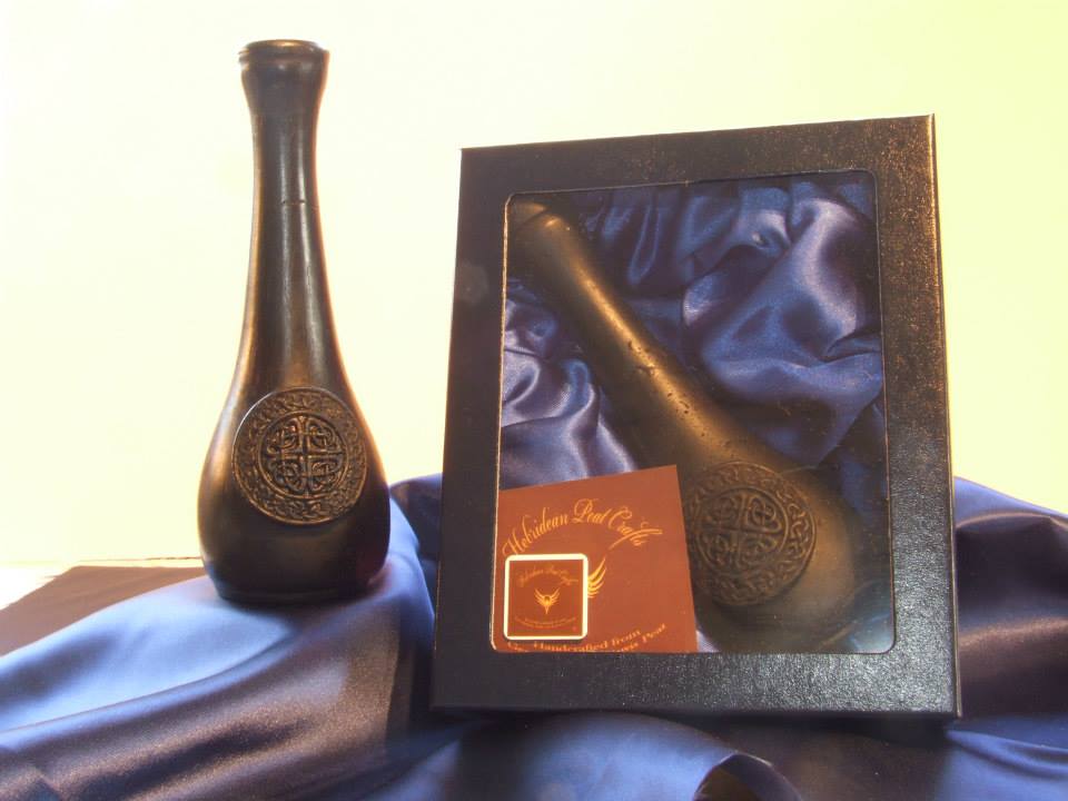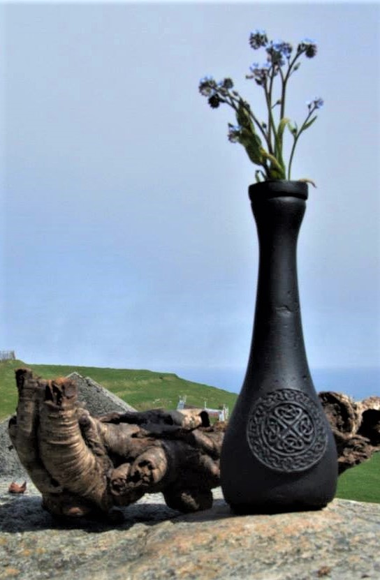 The last remaining and unique Hebridean Peat Craft Stem vase with Celtic knot motif for sale is hand crafted from Hebridean Composition, it has been hand finished and is signed and dated 2013 and comes in a presentation box with an informational and care leaflet.
